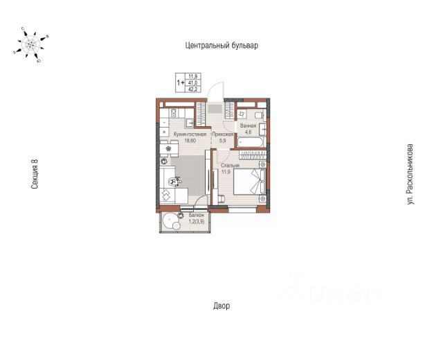 Светлая квартира на солнечной стороне Уютная кухня-гостиная с выходом на балкон Функциональная спальня правильной формы с видом в тихий двор Вместительная ванная правильной формы без шахты инженерных коммуникаций внутри помещения Просторная прихожая с нишей под шкаф-купе Высота потолка 2,7 м Улучшенная предчистовая отделка