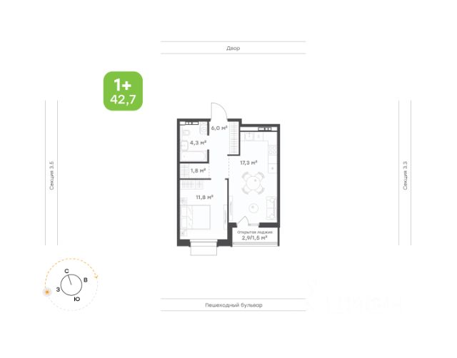 Уютная кухня-гостиная с выходом на открытую лоджию Комфортная спальня Небольшая гардеробная или кладовая Прихожая с нишей под шкаф Вместительная ванная Окна на солнечную сторону Высота потолков 2,7м Улучшенная предчистовая отделка
