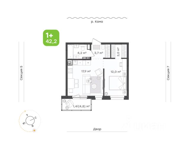 Эргономичная квартира евроформата с максимально функциональной площадью Окна на юго-восток Кухня-гостиная с выходом на балкон и вторым окном Спальня с видом в тихий двор Выделенная гардеробная Ниша под шкаф в прихожей Высота потолка 2,7 м Улучшенная предчистовая отделка