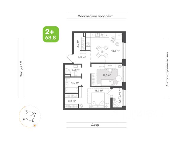 Окна на 2 стороны света Классический формат с отдельной кухней и 2 комнатами Гостиная с выходом на лоджию Детская правильной формы Ванная комната и дополнительный санузел для комфорта семьи Высота потолка 2,73 м Улучшенная предчистовая отделка