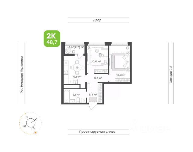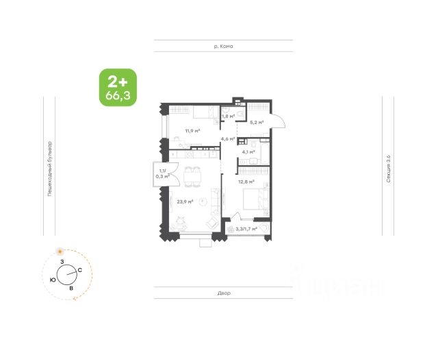 Наполненная светом кухня-гостиная с выходом на французский балкон Родительская спальня и детская правильной формы Два закрывающих потребности всей семьи санузла Высота потолков 2,7м Улучшенная предчистовая отделка