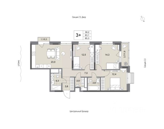 Пpoдaется трехкомнатная квартира площадью 78,83 м².