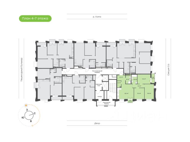 Квартира на 2 стороны света с видом на Каму и в тихий двор Увеличенная кухня-гостиная с большим окном Мастер-спальня с собственным санузлом и выходом на лоджию Детские размещены в приватной зоне в удалении от комнаты родителей и кухни-гостиной Гардеробная Ниши для организации мест хранения в прихожей и одной из детских Высота потолка 2,7 м Улучшенная предчистовая отделка