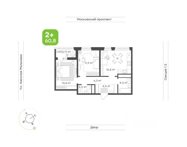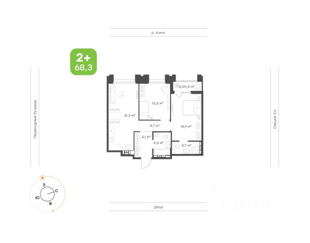 Квартира на 2 стороны света Функциональная кухня-гостиная с выходом на лоджию. Французский балкон на ряде этажей Мастер-спальня с собственным санузлом Уютная эргономичная детская Вид на Каму из кухни-гостиной, окна детской и спальни выходят в тихий двор Ванная правильной формы без шахты инженерных коммуникаций внутри помещения Высота потолка 2,7 м Улучшенная предчистовая отделка