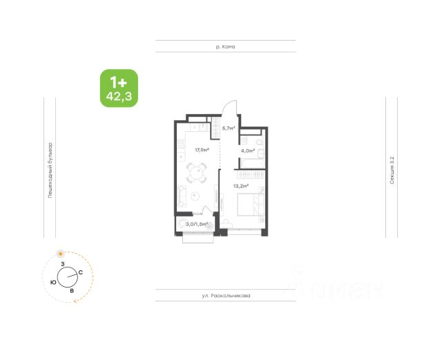 Выделенная ниша в прихожей для шкафа-купе Функциональная кухня с выходом на балкон Ванная с местом под стиральную машину Комфортабельная спальная с рабочей зоной и выделенной гардеробной Возможность организации дополнительного летнего места отдыха на балконе Высота потолка 2,7 м Улучшенная предчистовая отделка