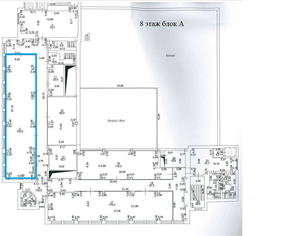 8 этаж 9-этажного здания, блок А ( тех. помещения 3). Год постройки 2012г. Состояние - хорошее; фундамент - монолитные; наружные стены(материал) - навесные панели с кирпичными вставками с отделкой из композитных панелей "Алюкабонд", цоколь облицован керамогранитным плитами; перегородки керамический кирпич, гипсокартон, остекление; пол-плитка; отделка потолков - подвесные, гипсокартон; вид отопления - центральное; система вентиляции и кондиционирования -центральная; системы электро-, тепло-, водоснабжения и канализации имеются