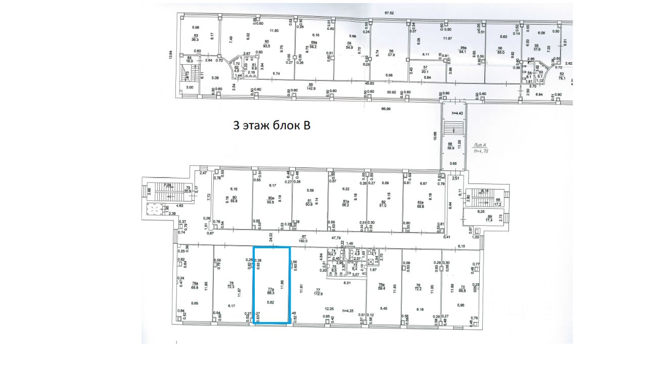 3 этаж 3-этажного здания, блок В (тех. помещение 77а). Год постройки 2012г. Состояние - хорошее; фундамент - монолитные; наружные стены(материал) - навесные панели с кирпичными вставками с отделкой из композитных панелей "Алюкабонд", цоколь облицован керамогранитным плитами; перегородки керамический кирпич, гипсокартон, остекление; пол-плитка; отделка потолков - подвесные, гипсокартон; вид отопления - центральное; система вентиляции и кондиционирования -центральная; системы электро-, тепло-, водоснабжения и канализации имеются