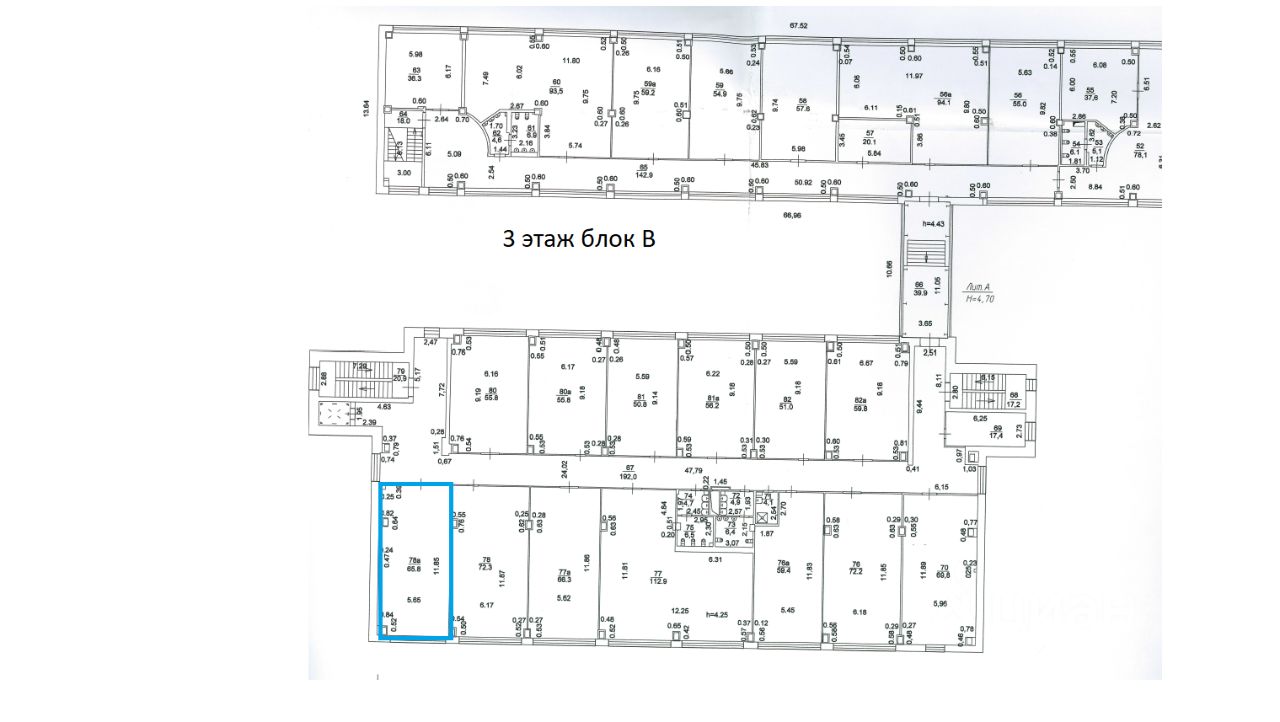 3 этаж 3-этажного здания, блок В (тех. помещение 78а). Год постройки 2012г. Состояние - хорошее; фундамент - монолитные; наружные стены(материал) - навесные панели с кирпичными вставками с отделкой из композитных панелей "Алюкабонд", цоколь облицован керамогранитным плитами; перегородки керамический кирпич, гипсокартон, остекление; пол-плитка; отделка потолков - подвесные, гипсокартон; вид отопления - центральное; система вентиляции и кондиционирования -центральная; системы электро-, тепло-, водоснабжения и канализации имеются