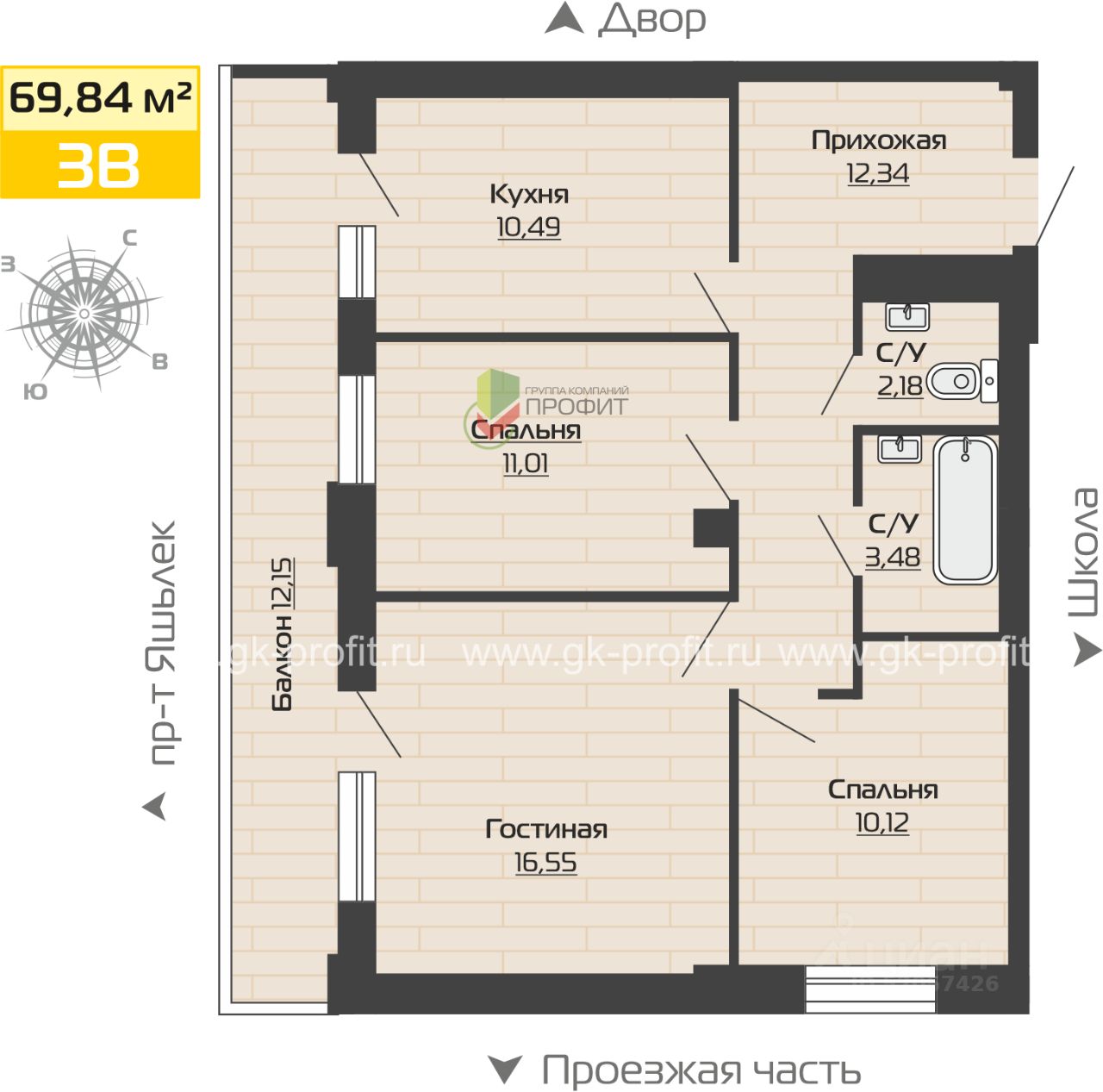 Продаётся 3-комнатная квартира в строящемся доме (дом 69-1-2), срок сдачи: III-кв. 2026, общей площадью 69.84 кв.м., на 21 этаже. Новый жилой дом от застройщика "ГК ПРОФИТ" расположен по адресу: Россия, Республика Татарстан, Набережные Челны, Залесный проспект