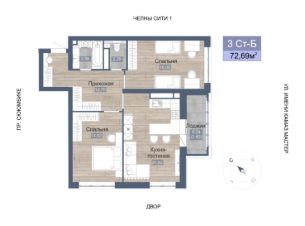 Продаётся 3-комнатная квартира в строящемся доме (Дом 3), срок сдачи: IV-кв. 2026, общей площадью 75.31 кв.м., на 21 этаже. Жилой комплекс по проспекту Сююмбике представляет собой 27-этажное здание.