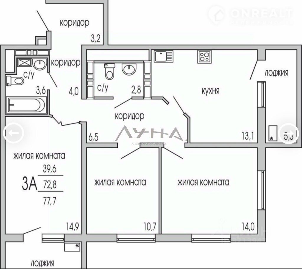 Общая площадь: 77,7 м² | Полезная площадь: 72,8 м²
