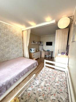 В квартире двухуровневые потолки, пластиковые окна, на полу ламинат, хорошие межкомнатные двери, в зале дверь купе. Квартира светлая и теплая. Также имеется обшитый и утепленный лоджия, где можно обустроить место для отдыха.