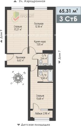Продаётся 3-комнатная квартира в строящемся доме (Дом 8), срок сдачи: II-кв. 2026, общей площадью 65.31 кв.м., на 1 этаже. Жилой комплекс "Авиатор" - это комплекс из девяти трехэтажных домов с тремя подъездами и собственным двором без машин с детской площадкой. ЖК "Авиатор" расположен на улице Аэродромной в районе Замелекесье Набережных Челнов.