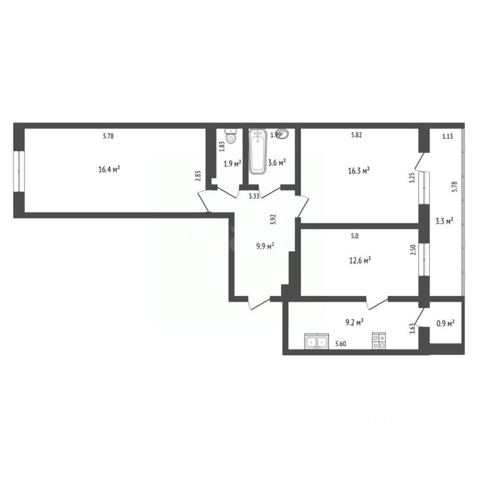 Окна выходят в разные стороны (распашонка).