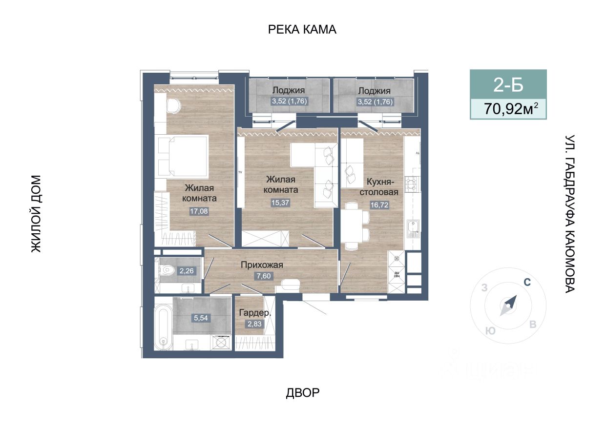 Продаётся 2-комнатная квартира в строящемся доме (Дом 4.1), срок сдачи: II-кв. 2026, общей площадью 74.44 кв.м., на 1 этаже. Жилой комплекс "Озерный" в поселке "Чаллы Яр", г. Набережные Челны.