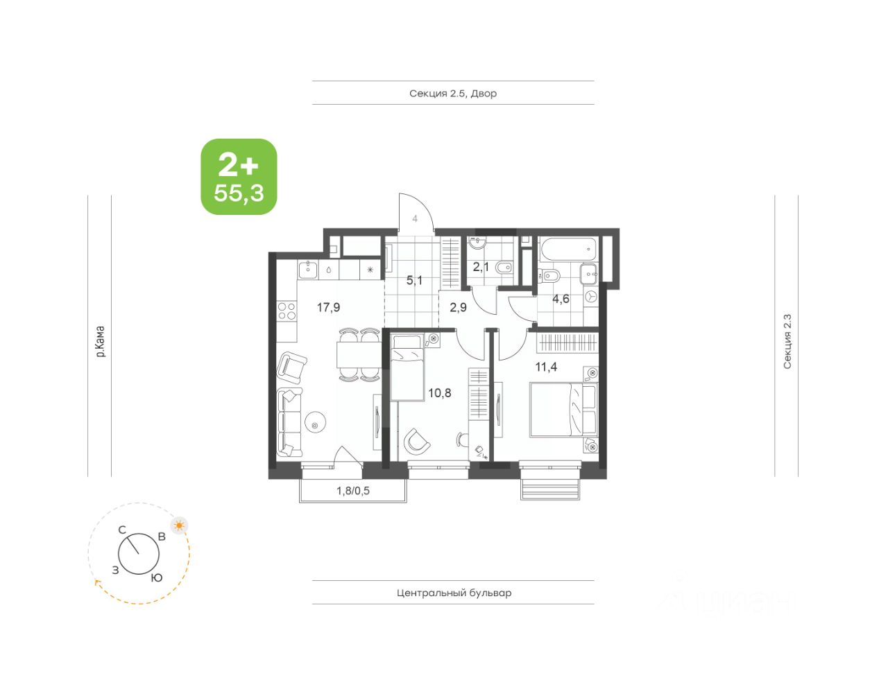 55,3 м²
