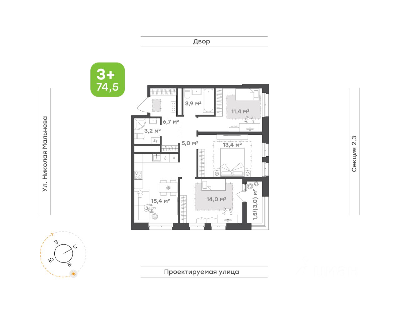 74,5 м²