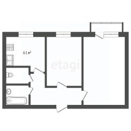 Продается уютная 2-комнатная квартира в панельном доме, расположенная на 3 этаже 5-этажного дома. Общая площадь квартиры составляет 43.4 кв. м, из которых 26.9 кв. м — жилая площадь, а кухня занимает 6.1 кв. м. Высота потолков — 2.6 метра, окна выходят как на улицу, так и во двор, что обеспечивает хорошее естественное освещение в течение всего дня.