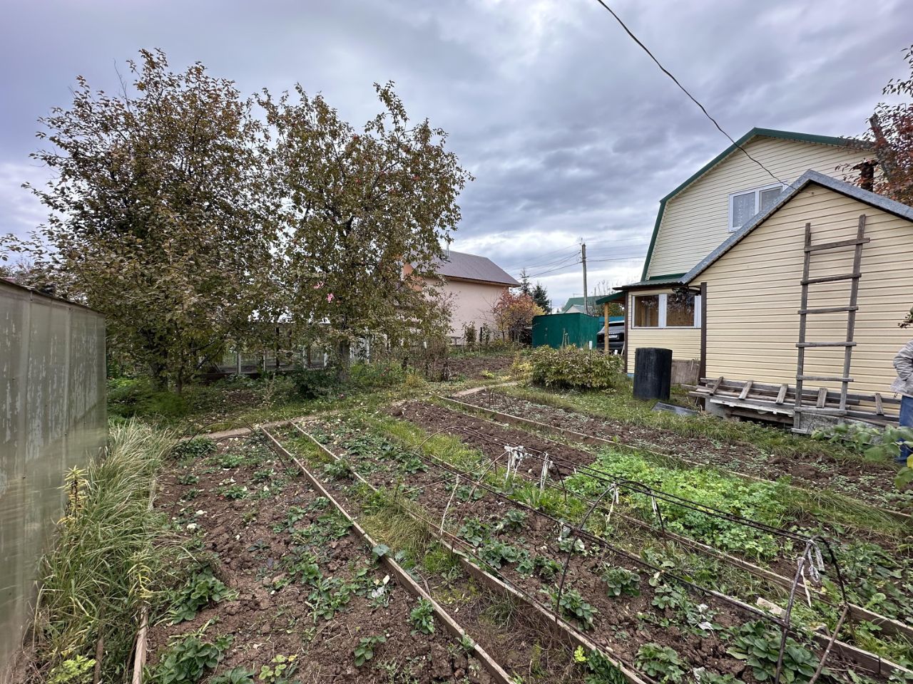 Участок: грядки, плодовые деревья (яблони, вишня, слива, облепиха, боярышник, калина), кустарники (малина, смородина, крыжовник, виноград), теплица, дорожки. Соседи живут круглый год; зимой проезд возможен. Тихое, зелёное место, товарищество обжитое.